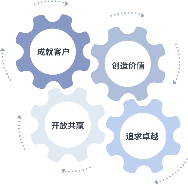 成就客户是一切决策的出发点,创造价值是衡量所有工作的标准,追求卓越是KY开元做事做人的态度,开放共赢是KY开元的格局也是最终的结果。价值观的齿轮环环相扣,推动着组织里的每个人不断向前。
